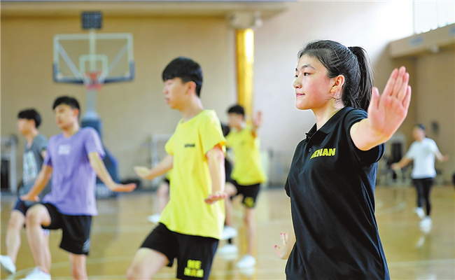 來自鄭州西亞斯學(xué)院和鄭州七中的18名運(yùn)動員正在進(jìn)行民族健身操訓(xùn)練。