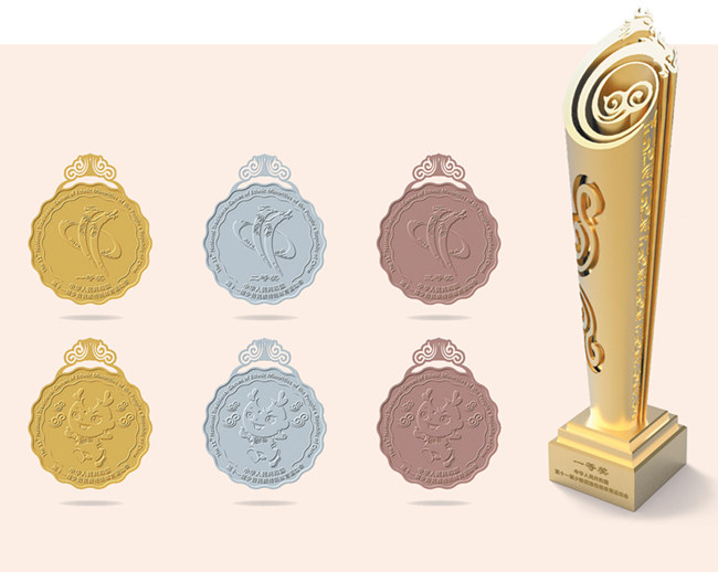 獎(jiǎng)杯《龍鳳書(shū)卷》,靈動(dòng)而不失莊重。獎(jiǎng)杯上端外觀基于會(huì)徽核心圖形“龍鳳”,具有較高的辨識(shí)度。龍鳳組成“11”圖案,呈相依相伴騰飛之勢(shì),中間升騰古老的祥云圖案,彰顯中華文明生生不息的活力。獎(jiǎng)杯底座由三級(jí)臺(tái)階組成,寓意“三個(gè)離不開(kāi)”(漢族離不開(kāi)各少數(shù)民族,各少數(shù)民族離不開(kāi)漢族,各少數(shù)民族之間也互相離不開(kāi))思想和步步高的美好祝福,激勵(lì)運(yùn)動(dòng)員奮力拼搏。