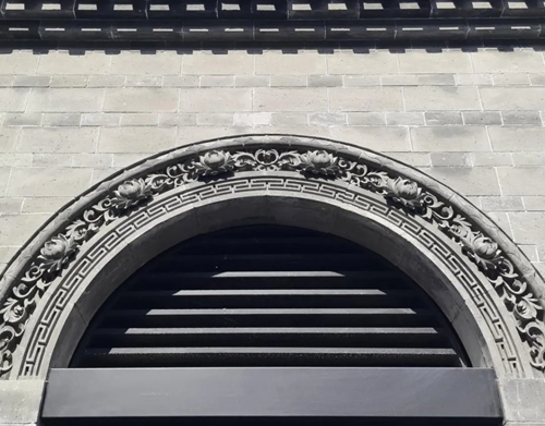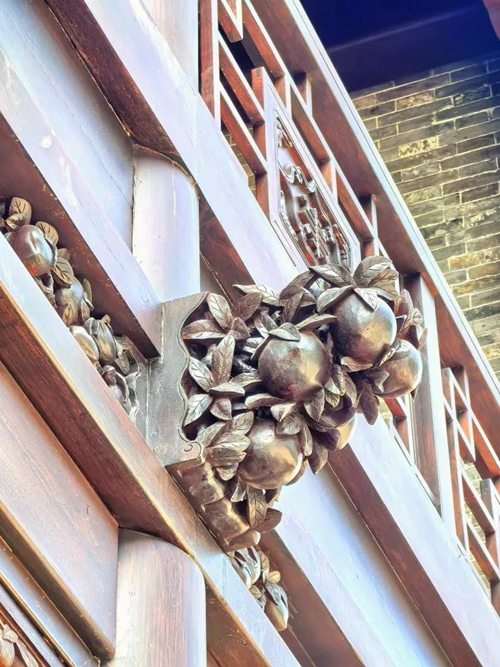 進(jìn)入北門,首先映入眼簾的是16號(hào)樓,其主題為壽桃,主題來源于信陽鄧穎超祖居,祖居繡樓內(nèi)部裝飾有壽桃石雕,我們便選取此圖案進(jìn)行創(chuàng)作,在16號(hào)樓的墀頭、雀替、卡子花處均有精美的壽桃紋樣。