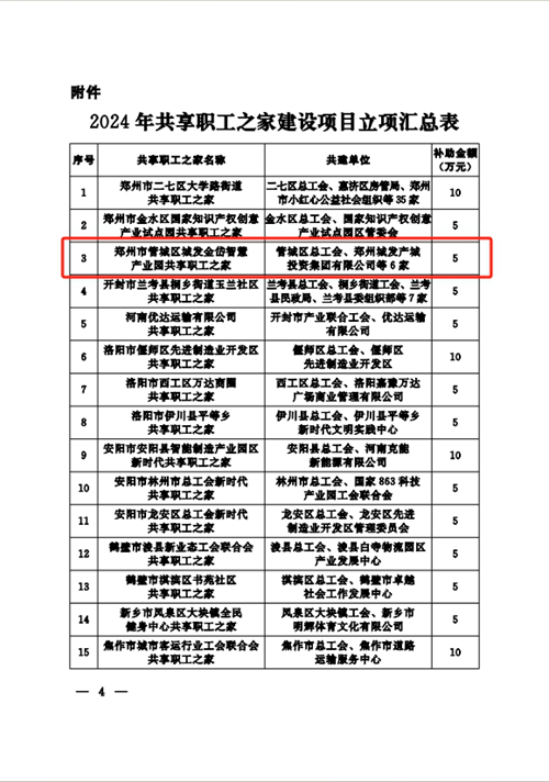 近日,河南省總工會發(fā)布《關于2024年共享職工之家建設項目立項的通知》,決定對城發(fā)金岱智慧產業(yè)園共享職工之家等32個共享職工之家建設項目進行立項,并對城發(fā)金岱智慧產業(yè)園共享職工之家給予資金補助,鄭州市僅有三家職工之家獲得立項,這是城發(fā)金岱智慧產業(yè)園共享職工之家建設運營后取得的第一份殊榮。