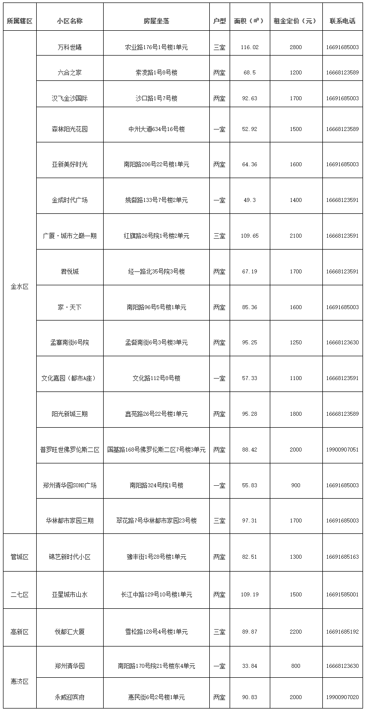 金水區(qū)15套配租房源所在小區(qū)包括萬科世曦、六合之家、漢飛金沙國(guó)際、森林陽(yáng)光花園、亞新美好時(shí)光、金成時(shí)代廣場(chǎng)、廣廈·城市之巔一期、君悅城、家·天下、孟寨南街6號(hào)院、文化嘉園(都市A座)、陽(yáng)光新城三期、普羅旺世佛羅倫斯二區(qū)、鄭州清華園SOHO廣場(chǎng)、華林都市家園三期。